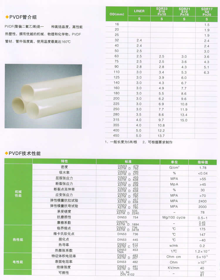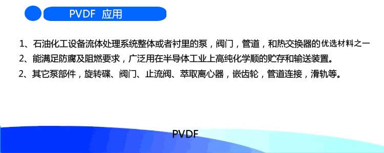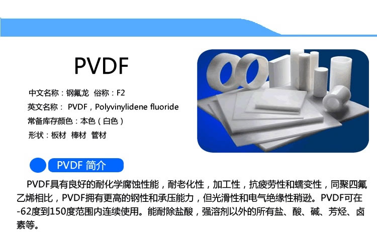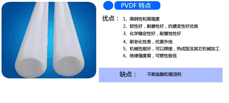 PVDF又稱聚偏氟乙烯,它的化學穩定性良好,具有優良的耐化學腐蝕性、耐候性和良好的耐熱穩定性,可在-62℃~150℃溫度范圍內長期使用。同時電解常數大,是良好的絕緣材料之一。能耐除強堿性胺、強溶劑外的所有鹽、酸、堿、芳徑、鹵素等介質。不燃、耐疲折斷、抗磨損、自潤滑性能好,雖原料進口,價格昂貴,一次性投入大,但價格大大低于進口管材,并以其優良耐腐蝕性能,無與倫比的使用壽命、安全系數高,將給您帶來顯著的綜合經濟效益。